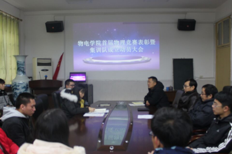 世界杯官网首届物理竞赛自2017年12月17日下午在八教1-1举办比赛、25日角出刘大东等28名优秀同学,到此已完美收官。2018年1月5日上午10:00在物理楼二楼会议室举行了竞赛表彰暨集训队成立动员大会。出席大会的有副院长刘明伟、院党委副书记杜鑫、院实验中心主任何雄辉老师、院创新创业实践中心谭长海老师和学工办孙婵老师。本次会议由孙婵老师主持。