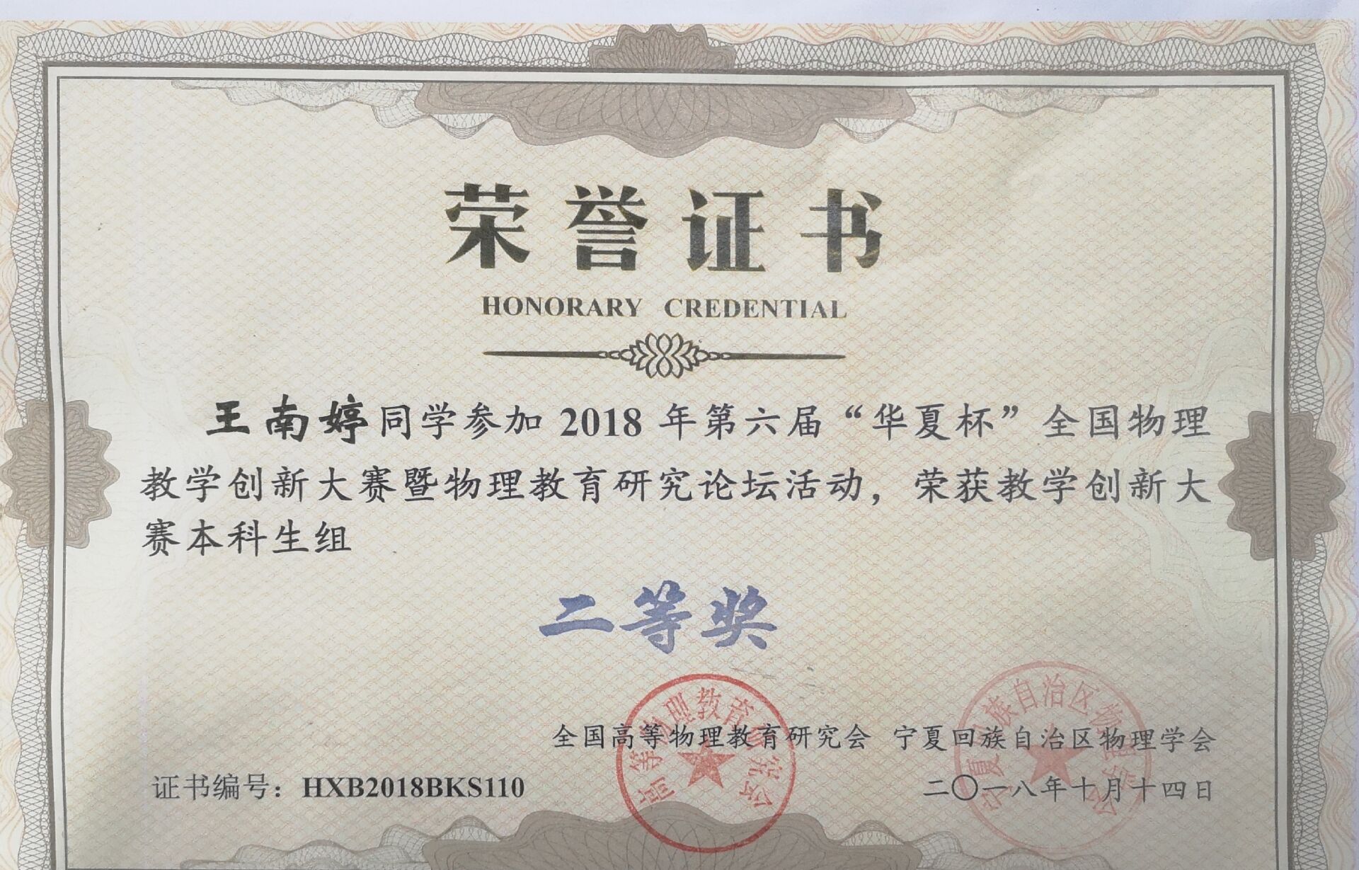 世界杯官网共有4名同学参加比赛并取得了优异成绩,其中本科生2名,研究生2名,向洁茜获得教学创新大赛本科生组二等奖、王南婷获得二等奖,旷紫薇获得教学创新大赛研究生组二等奖、王璇获得三等奖,我校荣获优秀组织奖,此次带队老师为世界杯官网物理系唐京武老师。