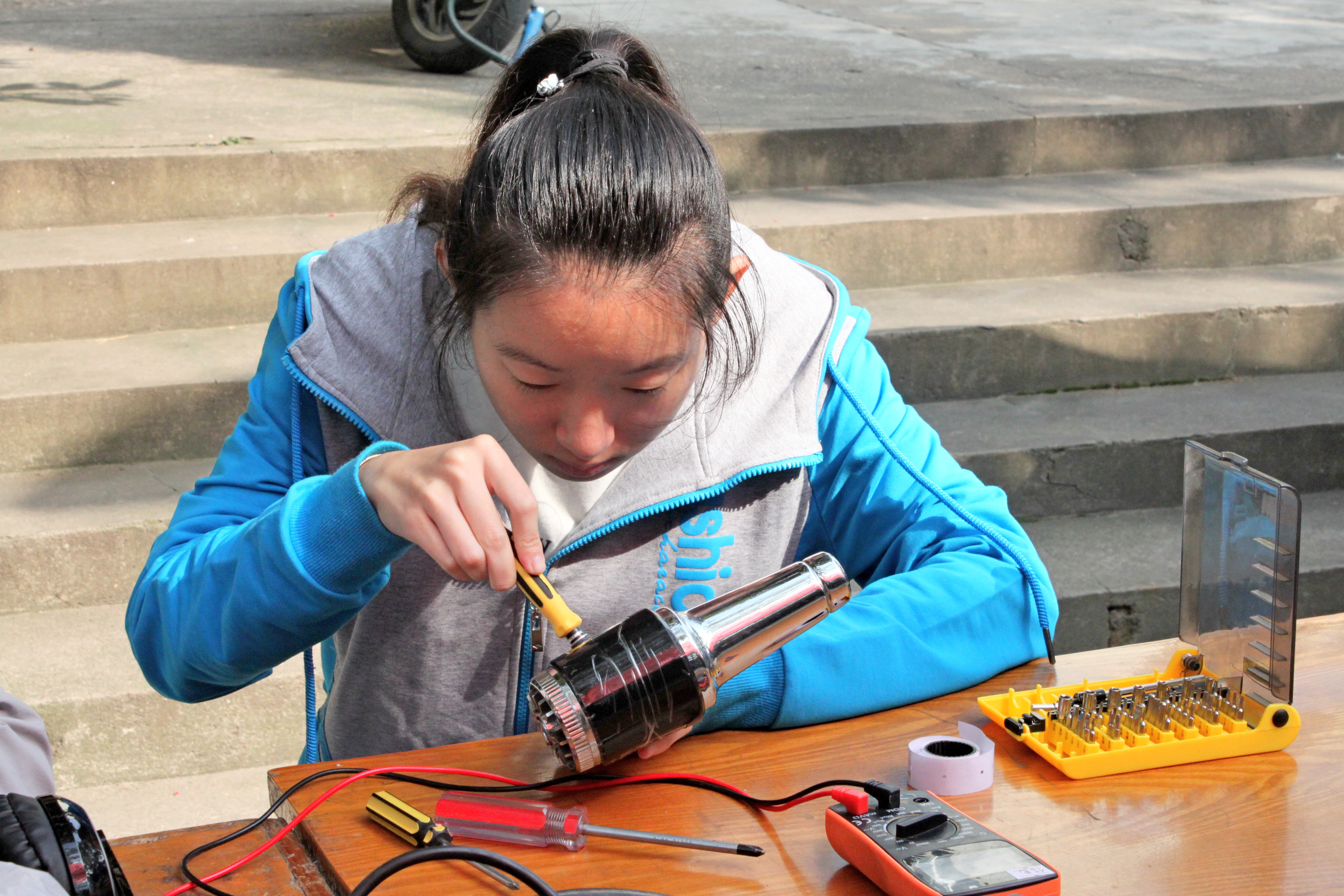 在这样一个阳光明媚的秋日里,看到义务维修的摆点后,路人纷纷驻步,前来咨询自家的小家电是否可以维修,摆点处的同学们耐心回答,在答疑解惑的同时强调了活动的结束时间。卢长吾书记帮助同学们搭建好义务维修摆点处的帐篷后,认真地与信电协会的同学们交流起维修小家电时的一些问题,讨论之余也自己上手维修起身旁的一个小电饭锅。信电协会的老成员经验丰富,熟练而又快速地修理各种电器。新成员也在他们的带领下,解决了不少问题。同学们精湛的维修技术和一丝不苟的工作态度,得到了在场师生们的一致好评。