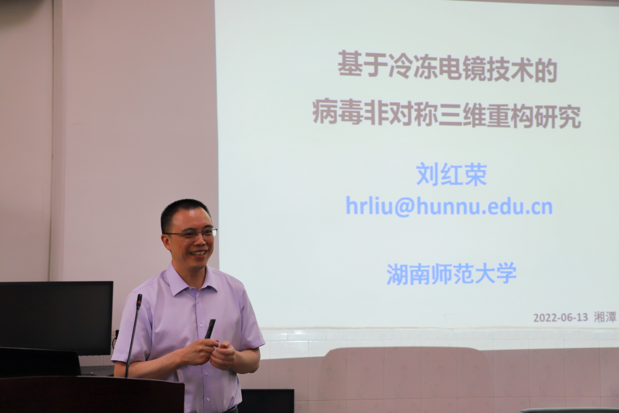 本次论坛的报告题目为《基于冷冻电镜技术的病毒非对称三维重构研究》。刘红荣教授首先介绍了三维重构的研究背景、进展及在物理学、材料学中的应用。凝练出基于冷冻电镜的病毒三维重构研究中的科学问题,并在此基础上着重阐述了以下两个方面的研究:1)基于数学物理方法发展的系列冷冻电镜病毒非对称三维重构方法;2)利用新方法解析的系列病毒非对称三维结构,及其揭示病毒生命周期的相关分子机制。报告涉及了数理学、计算科学、生命科学等多学科交叉,内容丰富,精彩纷呈。报告最后,刘教授还分享了自己的科研心得,现场氛围活跃。