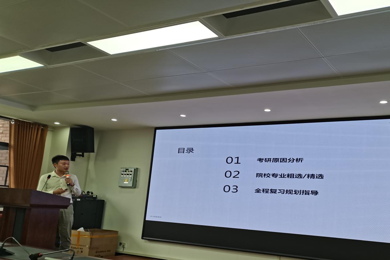 分享环节结束后,胡立昂从考研原因分析入手,指出“大环境下,考研是主流”,讲解了院校专业选择的几条原则,并就复习规划作出详细指导。