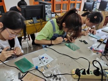 在大学二年级阶段就开设《电子技术实践》课程,以多种形式与内容推行实践教育,包括电子元器件的识别与检测、仪器设备的使用与调试、电子电路的焊接与测试、集成电路的设计与应用等。学生在还未深入学习有关课程时,提前了解课程的学习对象,可以帮助他们在未来的学业发展上做出准确的定位与预判。学生在这样的教学中表现出极大的热情,有时当老师还未到实验室就已有大量的学生提前等在门口,热切地希望能高质高效地完成项目。这两年,电子信息科学与技术专业的学生先后在实践课程中学习完成了单片机类的LED手摇棒、温湿度检测电路、电子密码锁、避障循迹蓝牙小车、激光电子竖琴等,为其参加各级各类学科竞赛打下了一定的基础。项目驱动、小组讨论、现场指导等丰富的教学形式也在师生之间建立了良好的沟通渠道。