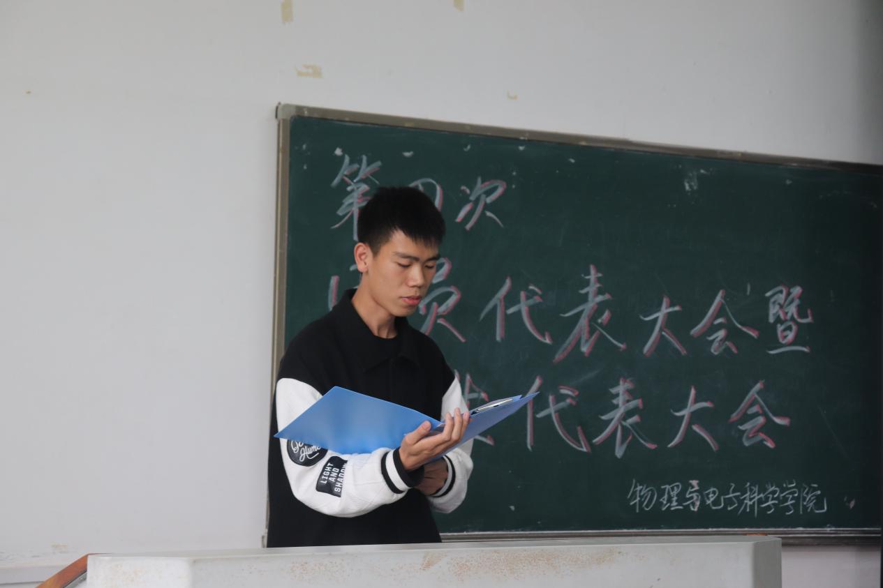 大会议程分为预备会议和正式会议。预备会议中,参会人员全体举手表决通过了一系列提案。正式会议伊始,参会人员全体起立奏唱国歌。随后,由贺玲致开幕词并宣读院党委批复,苗赞杰宣读校团委、校学生联合会批复,物电学院第四届双代会正式拉开序幕。