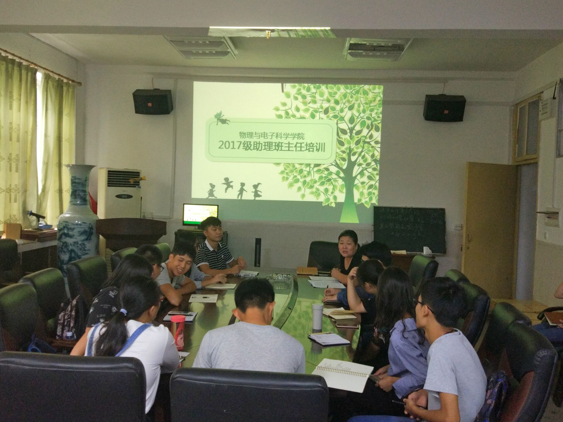 为使即将到来的新生开学报到工作有效地进行,9月5日14:25分,2017级助理班主任培训大会在物理楼二楼会议室成功召开。全体助理班主任与会,学工办孙婵老师、张华老师出席进行指导。