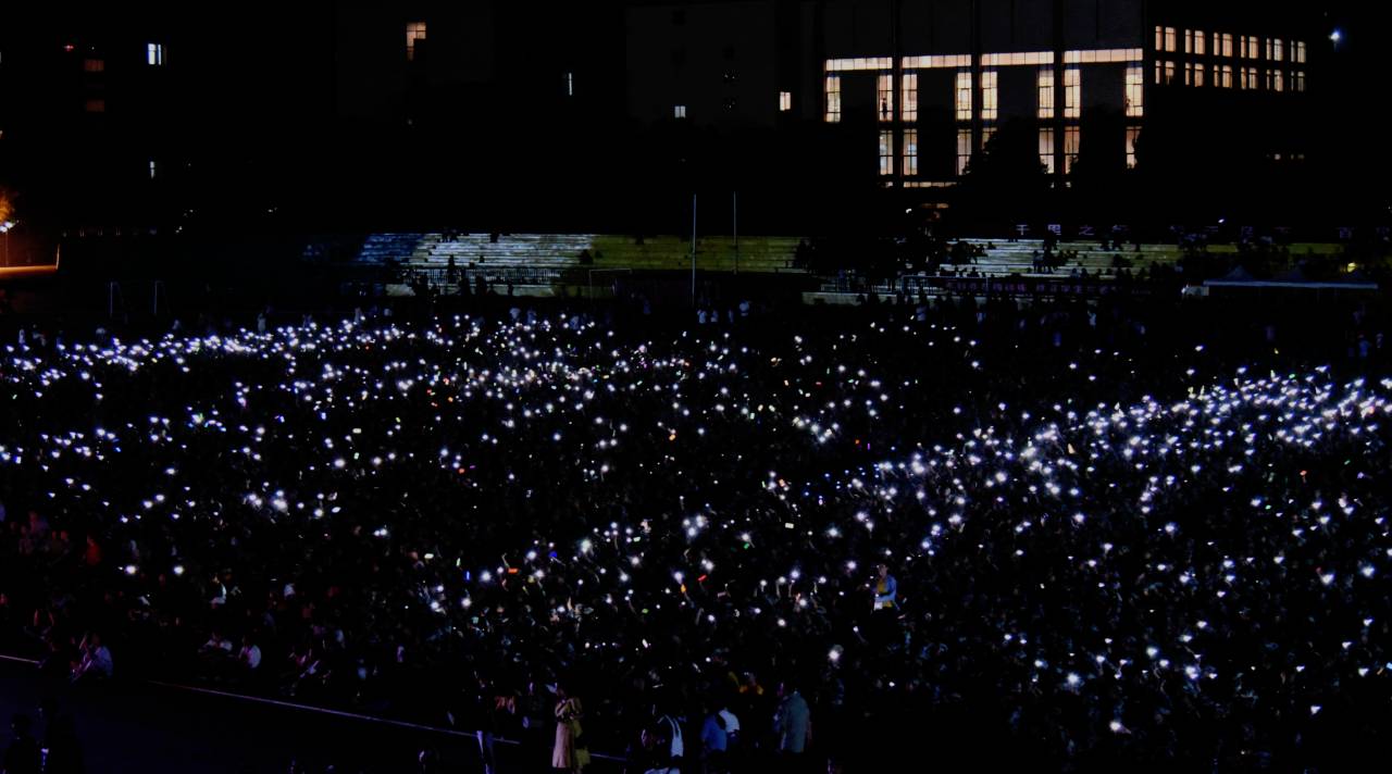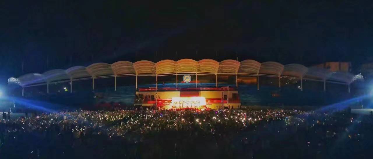 北校田径场夜风徐徐吹起,舞台灯光逐渐点亮,19级新生迅速静下来,9月17日晚7点半,我校“我和我的祖国”新生军训合唱比赛于北校田径场震撼举行。副校长胡石其、学工部部长尹风雨、武装部部长朱理哲莅临此次活动,并与艺术学院老师共同担任比赛评委。