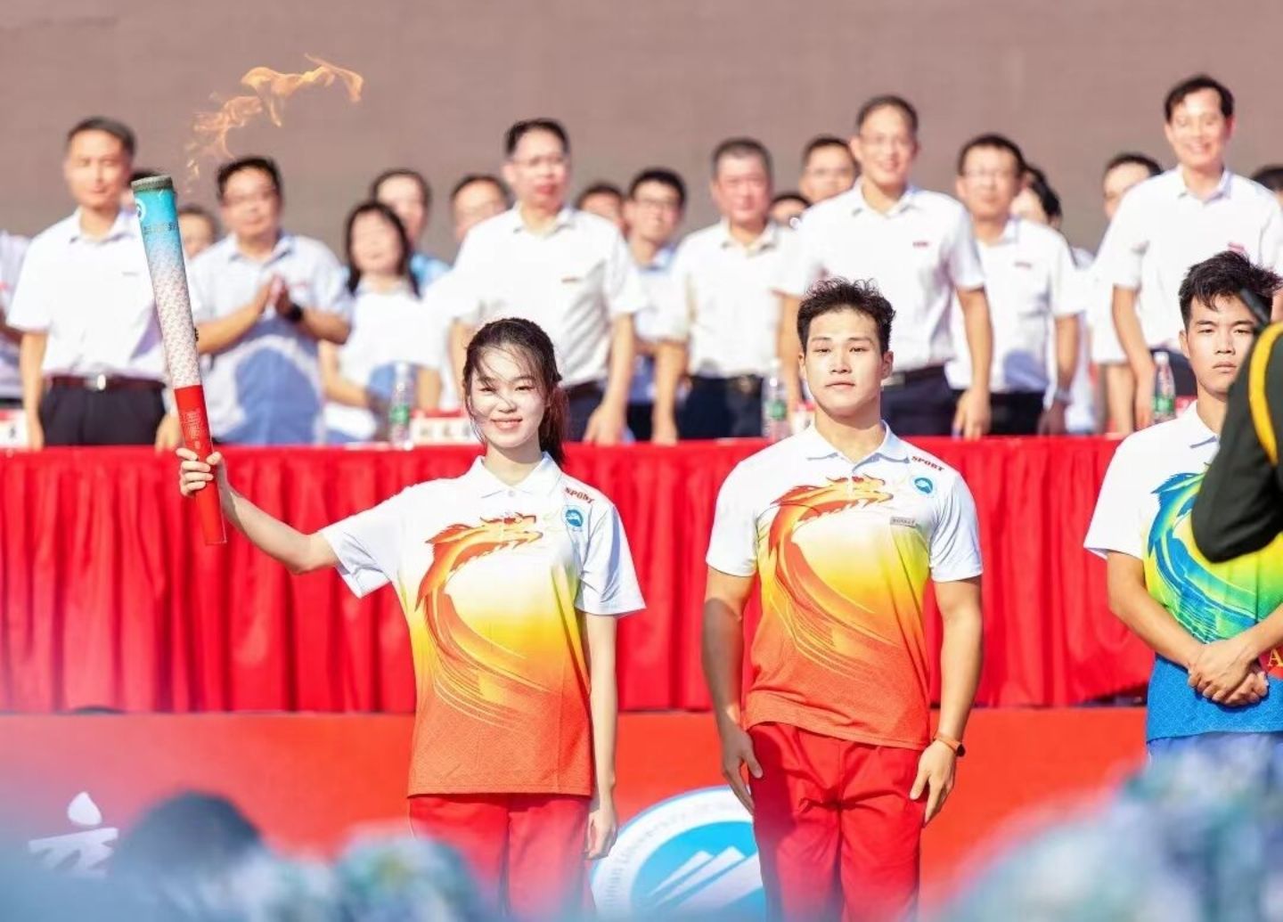 八点整,本次典礼随着万步炎教授“最美教师”的暖场视频开始。奏国歌,升国旗,全体师生行注目礼,隆重的开场仪式很快点燃了现场的气氛。随后由教师代表陈建教授以及校友代表唐光雨先生发言,他们深切地表达了对新一届湖科大学子,能够在一个崭新的、优秀的平台茁壮成长的祝愿。此后,学生代表上台进行发言。校领导为新生佩戴校徽,全场掌声雷动。在现场氛围进一步高涨之后,由全体新生共同宣读誓言,并通过背景屏对火炬传递进行了直播。全体师生伴着如火焰般的热情聆听了朱川曲校长的讲话。会议尾端,现场全体师生共唱校歌。